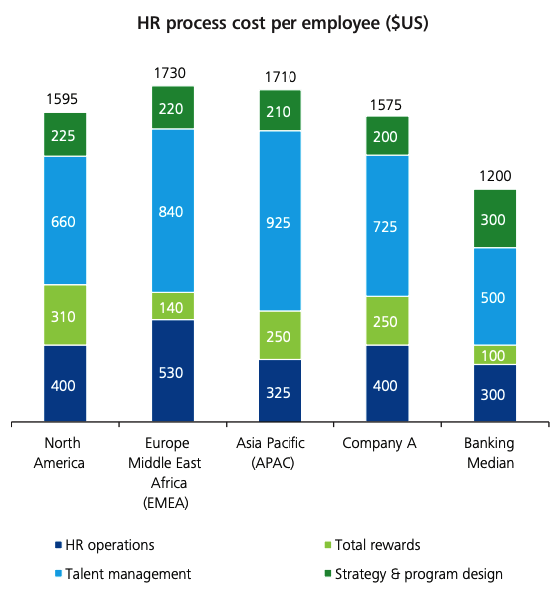 HR costs cover a variety of metrics. This could include the cost of how much it is to run the HR function or to cover HR budget metrics, such as cost per hire. As with other metrics, it is essential to ensure the data is consistent and comparable with organizations with similar characteristics. As an example, see below an extract from a Deloitte report which compares HR process cost per employee for banks: